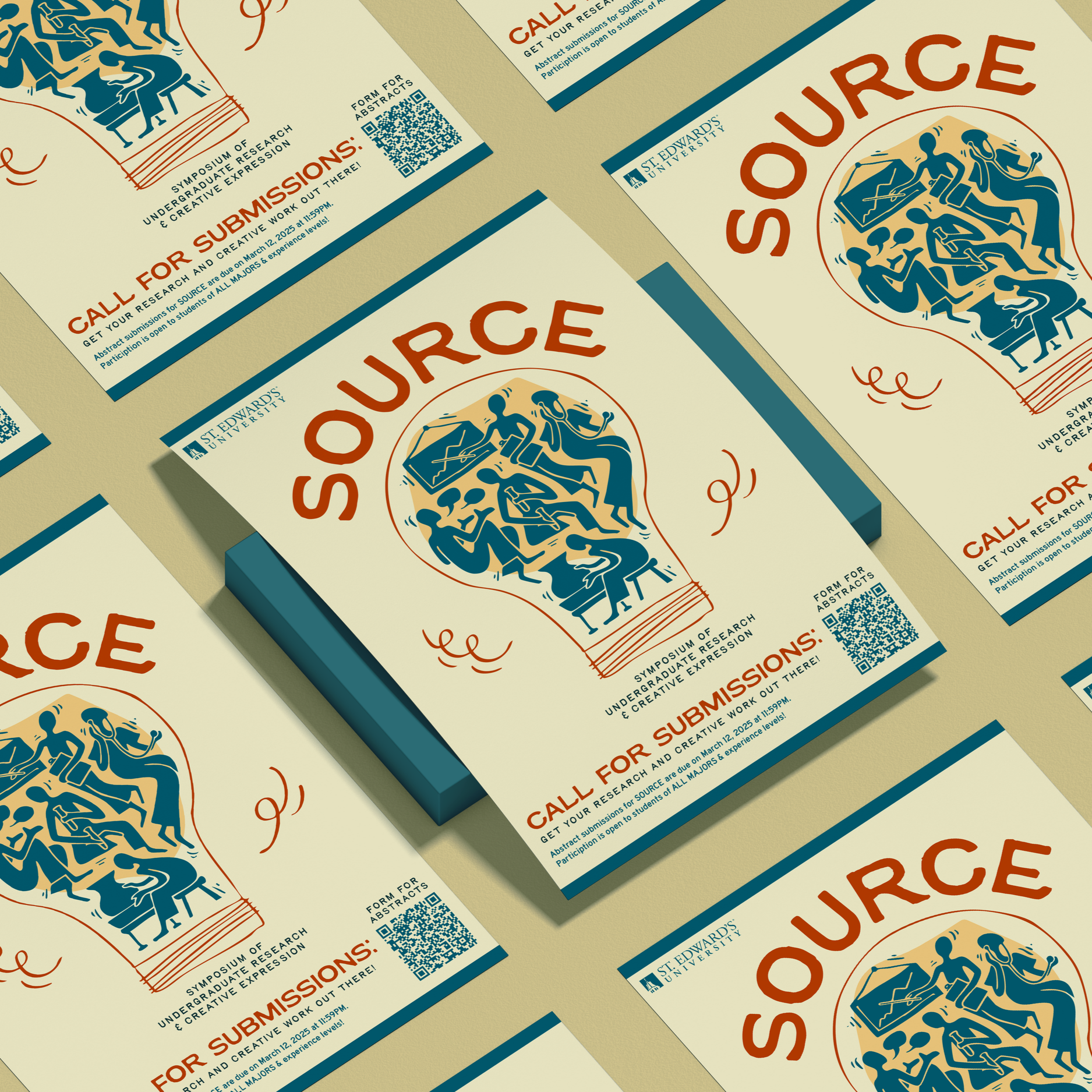 I designed the visual identity for SOURCE 2025 (Symposium of Undergraduate Research and Creative Expression), an annual event celebrating student work across all disciplines—from lab research and business proposals to creative writing, performances, and community projects.
